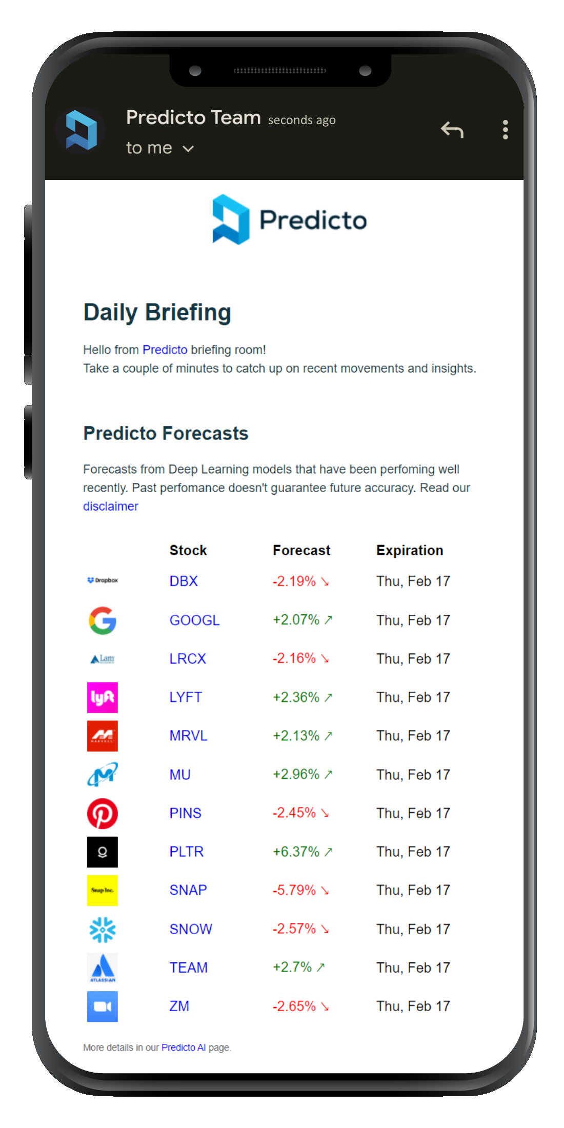 Predicto consumes raw data from a diverse list of data sources. Our models generate short-term forecasts and trades. By monitoring our models' recent performance, we filter those trades daily. Our AI market insights are delivered to your inbox daily or on your request. Everything automated.